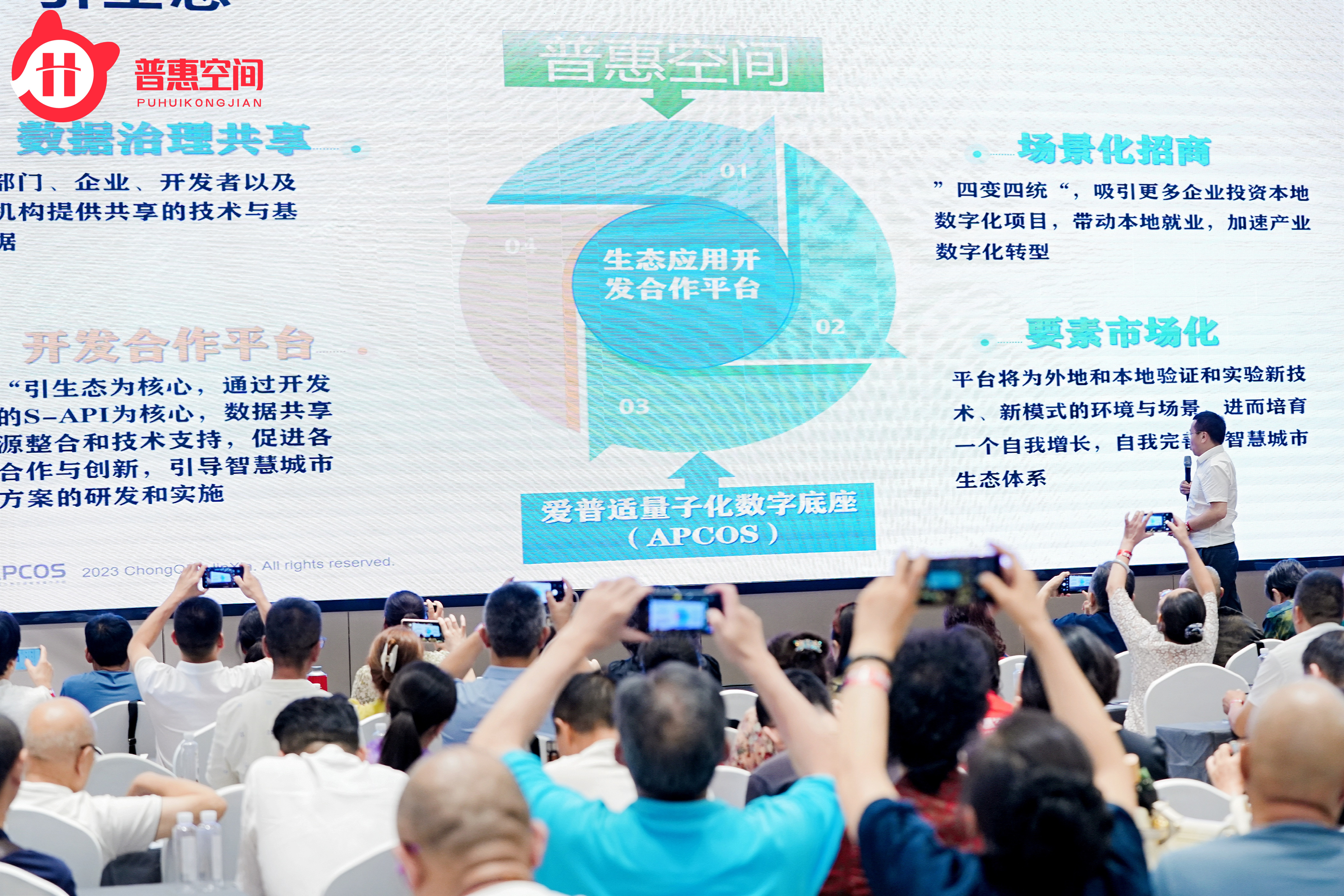 公司总裁陈总更是对如何基于爱普适量子化数字底座(APCOS)系统构建区域、全域数字经济高质量发展落地模型,从盘活存量、聚合流量、引入变量、带动增量、做大体量,政银企合作共建等板块大力助推县域经济实现产业本地、产值本地、税收本地、就业本地、数据本地等具体落地方案作了详细阐释。公司目前已在多个县市协助当地地方政府进行了全域数字经济产业升级试点,为中国乡村振兴和全民共同富裕摸索出了一条全新的实实在在落地并可全面复制的践行之路,